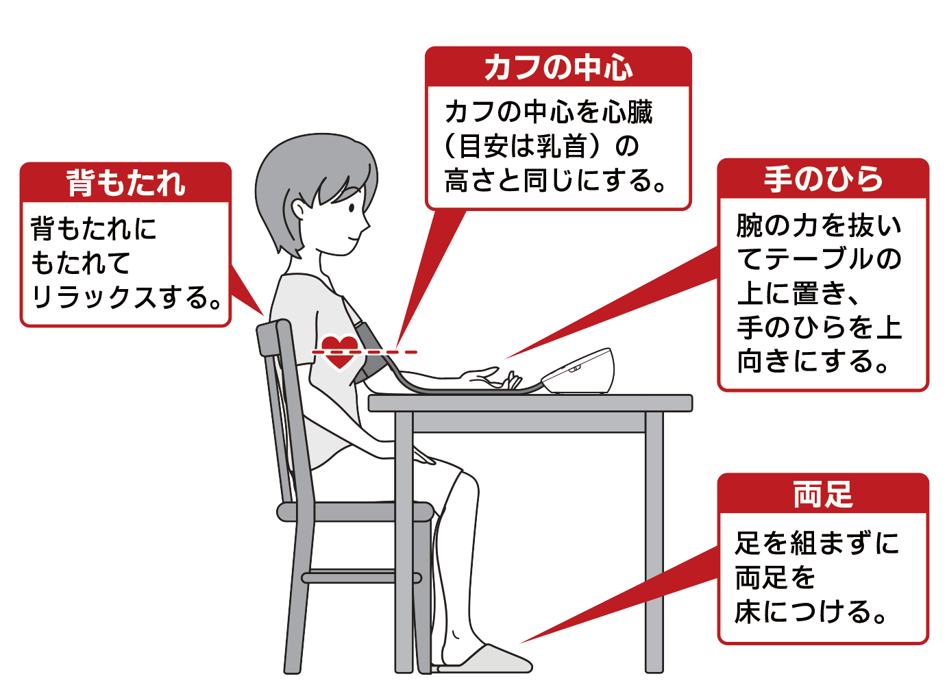 カフ(腕帯)を心臓の高さに合わせることは必須です。高さがズレると重力の影響で数値に大きな誤差が生じます。